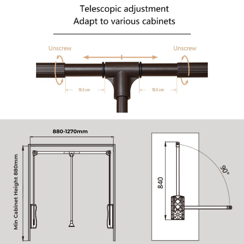 Its double cushioning mechanism ensures a controlled motion without rebound, while the soft-closing buffer return provides silent operation. The sturdy aluminum alloy frame combined with ABS plastic joints delivers high strength, durability, and protection for your garments. Easy to install without drilling, the adjustable telescopic rod fits various wardrobe widths, making it the ideal choice for modern homes seeking efficiency and style.