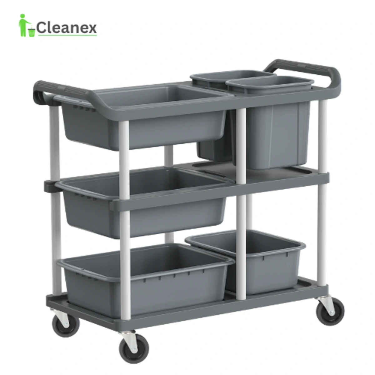 The Cleanex 3-Tier Modular Bin Utility Trolley (CRB001) is a highly efficient and organized solution designed for fast-paced commercial environments. Built with a strong metal frame and durable plastic bins, this trolley offers excellent stability and long-lasting performance for daily operations.