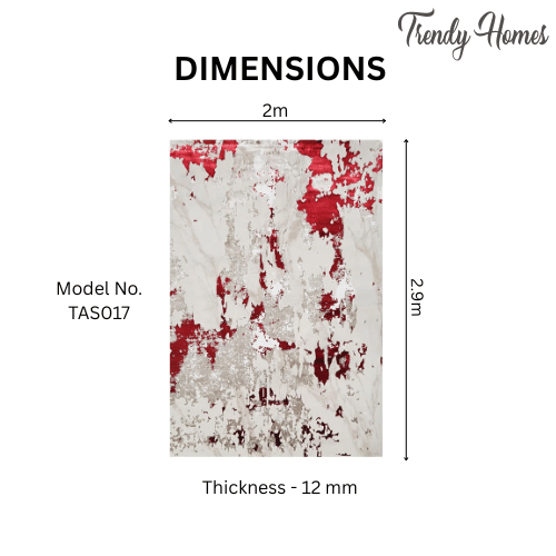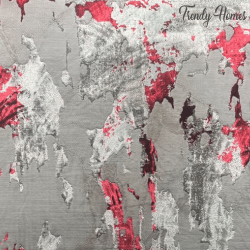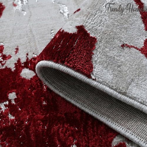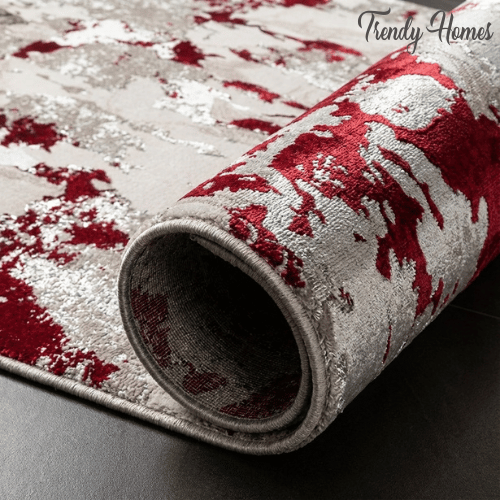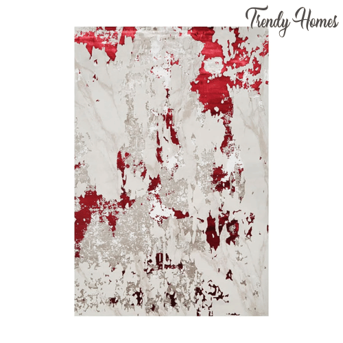 Crafted from a premium blend of polypropylene and polyester shrink yarn, the rug delivers excellent durability with a soft, luxurious feel underfoot. The advanced shrink yarn technique creates a high–low textured carpet surface, rich in layers yet balanced with a simple, elegant composition. Accents of deep crimson and ruby red flow across a neutral base of ivory, cream, and warm grey, creating striking contrast and visual depth. The distressed detailing adds dimension, making the red tones appear almost metallic and three-dimensional.