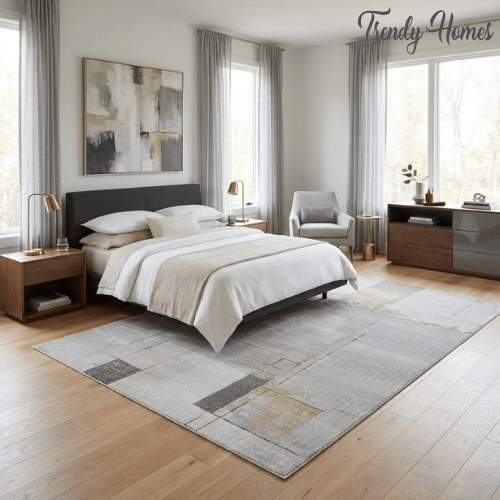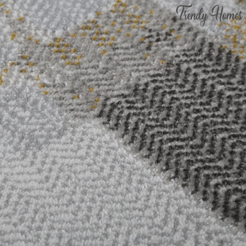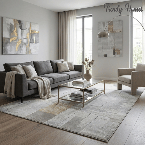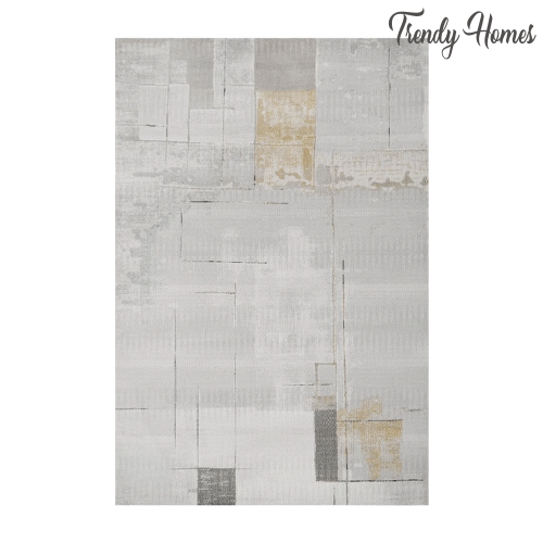 Its elegant cool-toned palette of silver, slate, and dove gray is enhanced by striking mustard gold accents and charcoal highlights, adding warmth and contrast without overpowering the space.Luxurious Aesthetic Aged Parchment Abstract Area Rug The distressed, faded detailing gives the rug a refined industrial and transitional modern aesthetic, making it feel like a curated gallery piece.