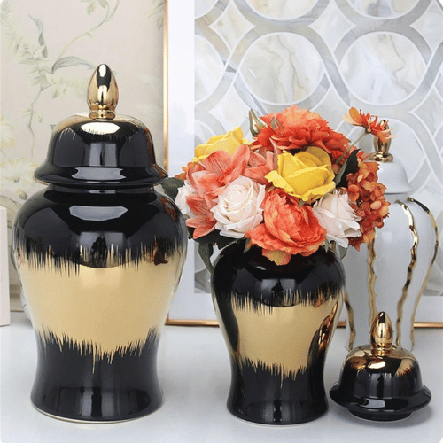 Elevate your home or office décor with the Luxurious Antique Deco Black Ginger Pot , a stunning centerpiece that combines modern elegance with antique-inspired charm. Crafted from high-quality, high-temperature porcelain, each piece is hand-painted and glazed, offering a smooth, durable finish that maintains its beauty for years. Its striking black-and-gold design adds a sophisticated touch to any setting, making it ideal for living rooms, dining tables, entryways, offices, restaurants, or hotels.