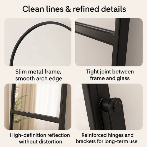 The Luxury Arched Standing or Wall Mount Mirror is a premium, customizable full-length mirror designed to elevate any interior space with its timeless silhouette and slim contemporary frame. Crafted with precision using a double-coated aluminum mirror, this piece offers exceptional clarity, durability, and resistance to moisture—making it suitable for bedrooms, dressing rooms, hallways, boutiques, and professional environments.