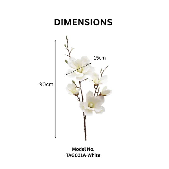 Crafted from durable plastic, the stem features five realistic flower heads complemented by subtle green leaves for added authenticity. Artificial 5 Heads Magnolia Flower Stem The tall 90 cm height makes it perfect for floor vases, statement centerpieces, and decorative arrangements in both modern and classic interiors.