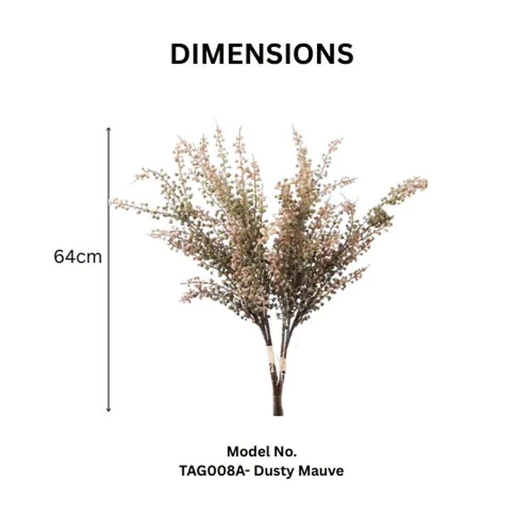 Enhance your floral arrangements with this Artificial Heather Spray in elegant dusty mauve.Artificial Heather Spray Dusty Mauve Designed as a decorative floral filler (often called a Stoebe or tiny berry spray), this stem adds beautiful texture, depth, and volume to bouquets and vase displays. The frosted, powdery finish creates a soft vintage look that perfectly complements farmhouse, rustic, and muted décor themes.
