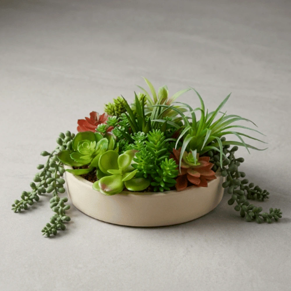 Crafted from high-quality plastic, each succulent is designed to mimic the natural look of real plants while offering long-lasting durability. Artificial Mixed Succulent Bowl Arrangement The arrangement is set in a ceramic bowl that enhances its contemporary appeal and provides a stable base.