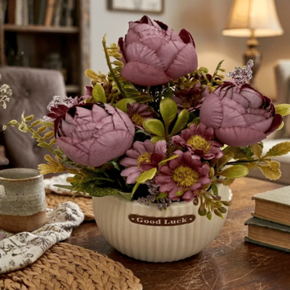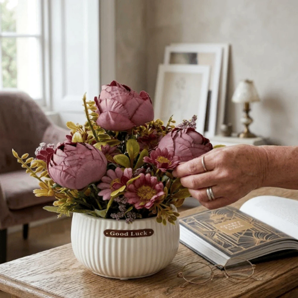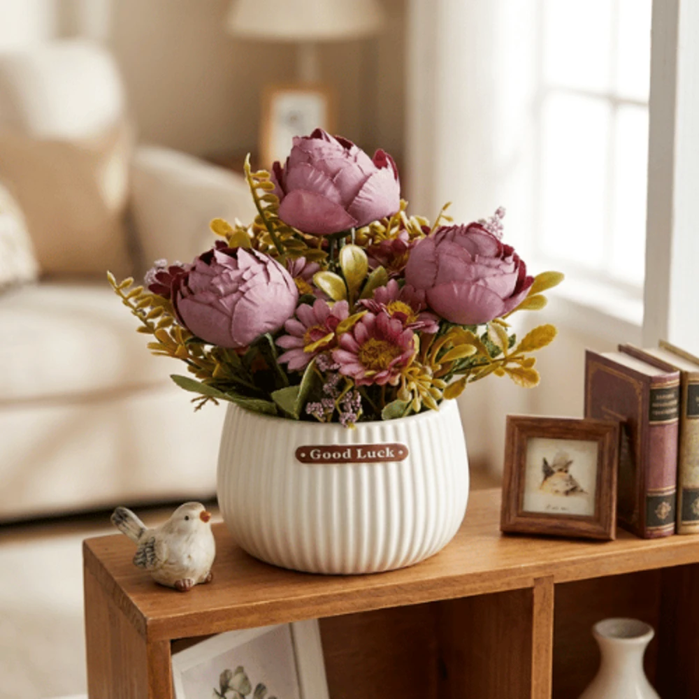 Crafted from high-quality plastic and fabric materials, the flowers maintain their vibrant color and shape over time, providing a long-lasting décor solution without fading. Artificial Peony Potted Arrangement This maintenance-free arrangement requires no watering, pruning, or sunlight, making it ideal for busy lifestyles.