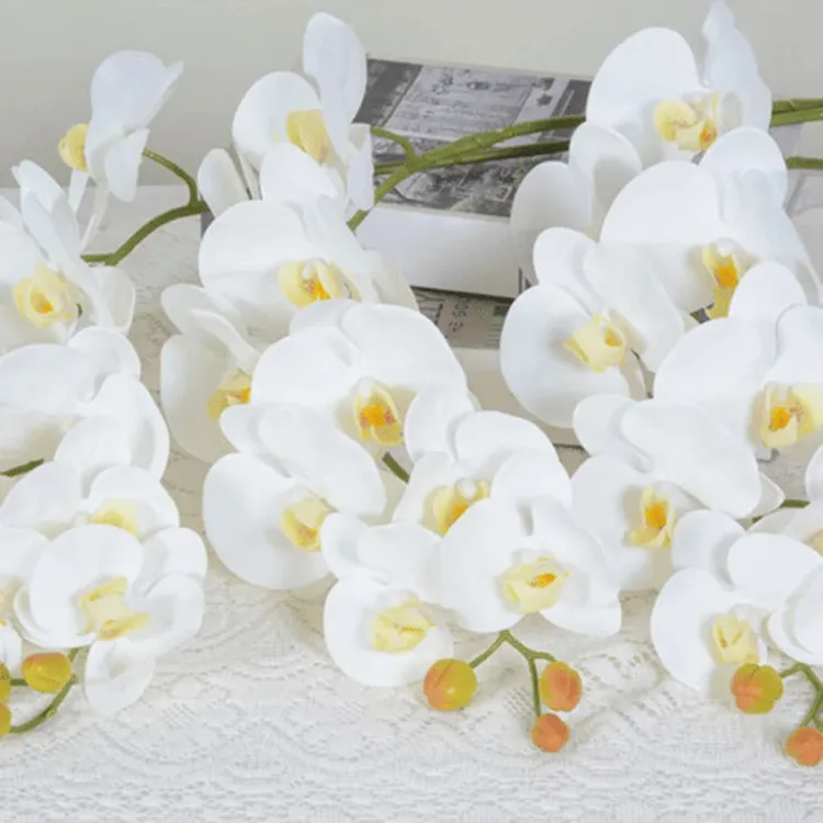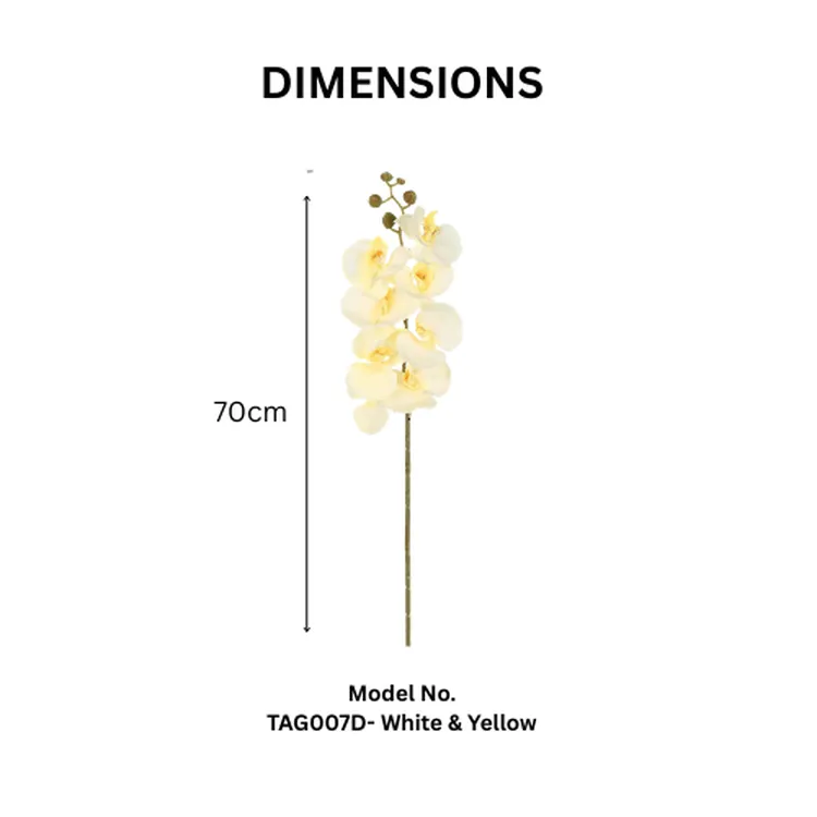 At 70 cm tall, the stem is ideal for tall vases, wedding décor, table centerpieces, or creative decorative displays. 3D Printed Artificial White & Yellow Orchid Flower Stem The thick, detailed petals mimic real orchids, providing a natural, fresh appearance without maintenance.