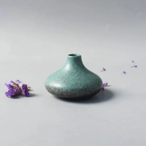 The vase showcases a refined two-tone gradient glaze—opening in a calm, muted teal blue at the rim and плавно drifting into a rich brownish-plum base. This natural transition reflects a sky-to-earth harmony that adds warmth, depth, and visual balance to any surface. Its rustic, handcrafted pottery texture paired with a matte finish enhances its artisanal character and tactile appeal.