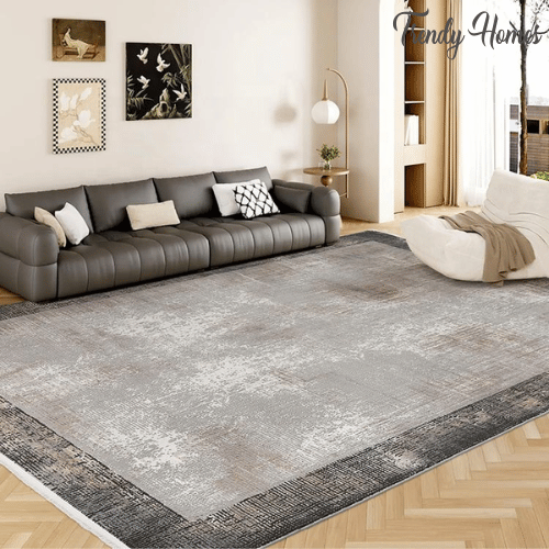 Make a striking statement with this Luxury Abstract Bold Charcoal Border framed area Rug, designed to anchor modern interiors with depth, contrast, and refined texture. Featuring a softly distressed abstract center framed by a bold charcoal border, this rug blends layered greys, taupe, and muted ivory tones to create a sophisticated, gallery-inspired look.