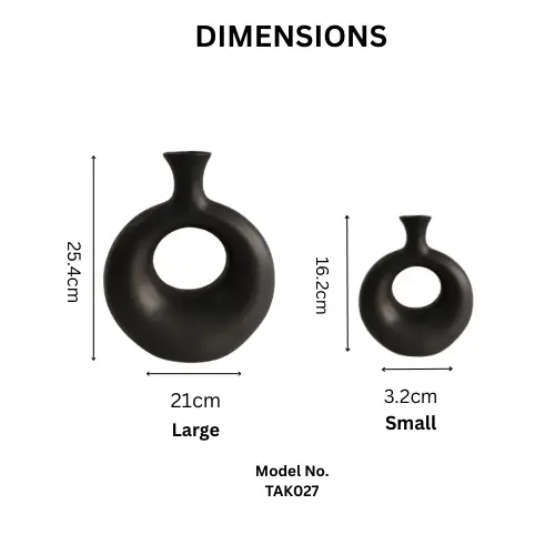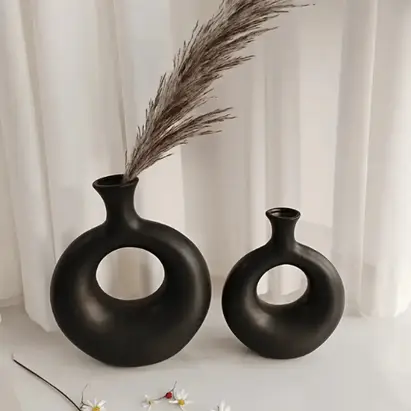 Elevate your interior with bold sophistication using the Elysian Orbit Obsidian Noir Table Vase Set. This striking 2-piece ceramic collection features sculptural hollow donut silhouettes in a deep obsidian black finish, delivering modern elegance with artistic impact.