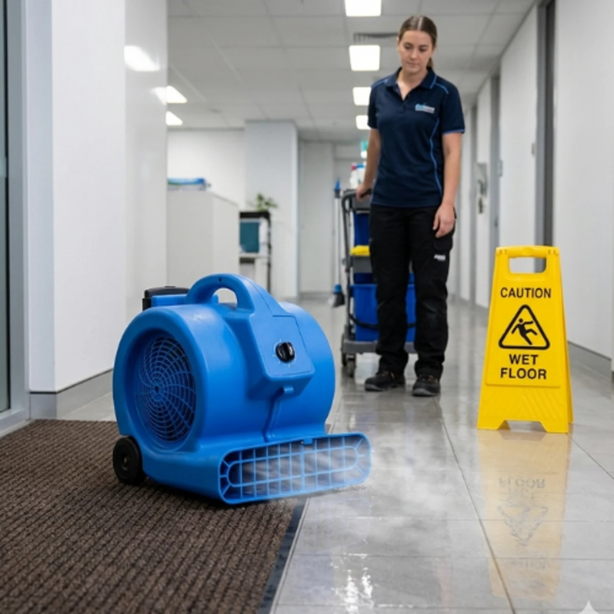 This powerful floor dryer is designed for fast and efficient drying of floors, carpets, and large surfaces in commercial environments. Equipped with a high-performance turbine, it generates strong airflow to speed up the drying process and improve overall cleaning efficiency. Its durable design, along with double rear wheels and a control rod handle, allows easy movement and convenient operation across large areas.