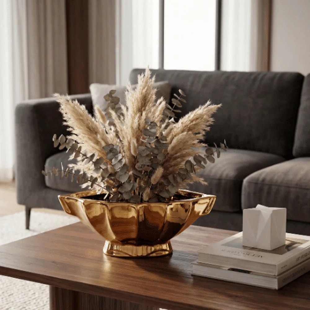 Elevate your décor with the Fluted Majesty Ceramic Bowl, a regal statement piece blending traditional ceremonial inspiration with modern craftsmanship. Its radiant gold finish and crown-inspired fluted silhouette add grandeur to any space, from contemporary living rooms to traditional interiors.