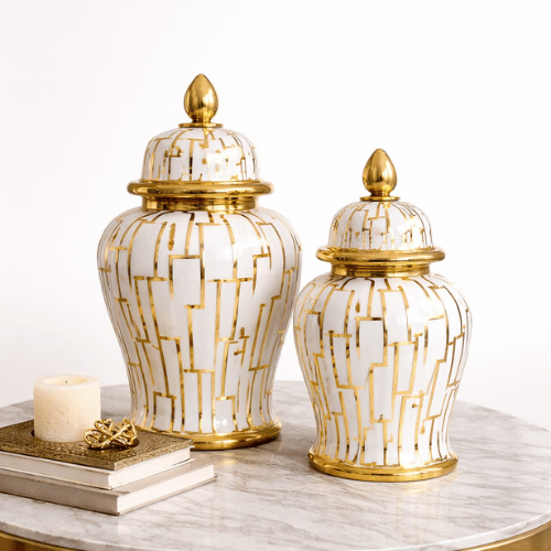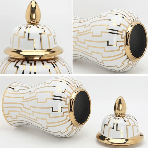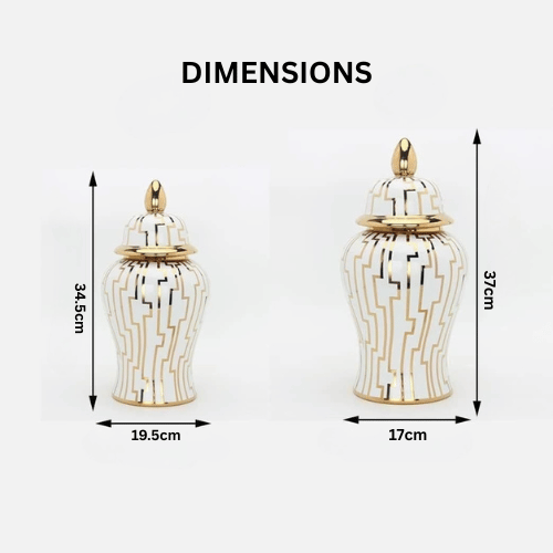 The elegant white-and-gold geometric design complements a variety of décor themes, including modern, luxury, classic, and minimalist interiors. This versatile ginger jar is also an excellent gift choice for housewarmings, weddings, birthdays, and festive celebrations, offering both beauty and functionality in one exquisite piece.