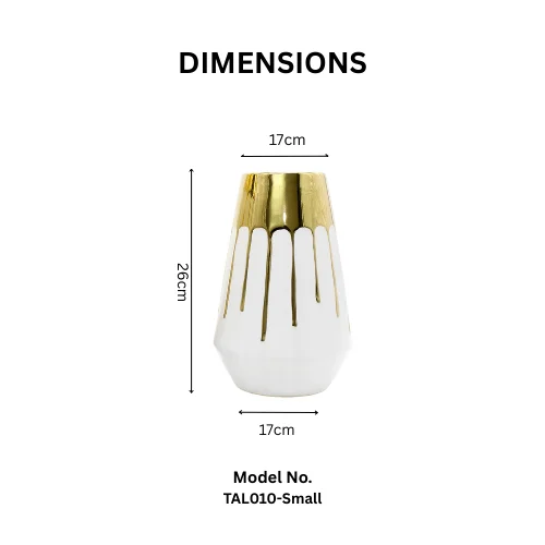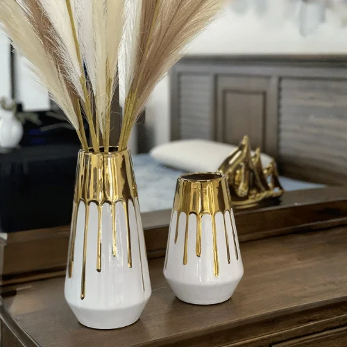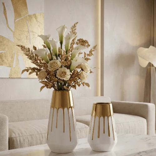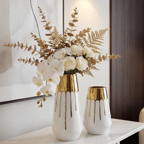 Add a refined touch to your interior with the Gilded Crown Table Vase, a premium ceramic décor piece that blends modern luxury with minimalist charm. Designed to complement elegant homes, hotels, and villas, this vase enhances any space with its artistic gold-pouring effect over a clean white ceramic body.