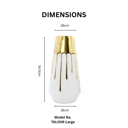 The striking gold drip design creates a sense of movement and sophistication, making the vase a standout accent on coffee tables, dining areas, consoles, shelves, or hotel lobbies. Its smooth glazed surface offers a polished finish that reflects light beautifully while maintaining a calm, modern aesthetic.
