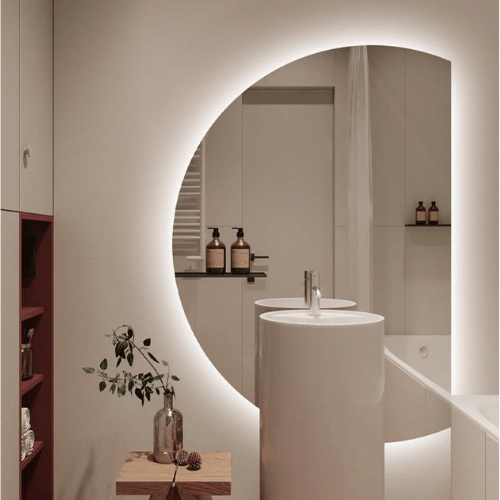 it offers superior durability, strength, and protection for your home. Available in two sizes—MIR05-60 cm and MIR06-90 cm— Modern Half Moon Floating Mirror with Light this half-circle LED mirror adapts perfectly to various room layouts. Modern Half Moon Floating Mirror with Light The LED backlighting adds ambient illumination, enhancing mood and visibility. Adjustable LED Brightness & Modes Light colour changing -White ,Warm ,White & Warm mixed