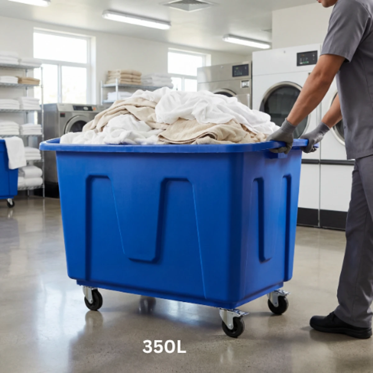 With its spacious 350-liter capacity, it allows for the easy transport of large volumes of linens, towels, and laundry, reducing the need for multiple trips and improving operational efficiency. The open-top design ensures quick loading and unloading, while the integrated ergonomic handle provides comfortable handling.