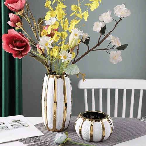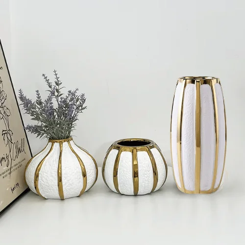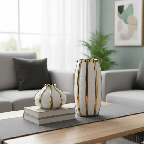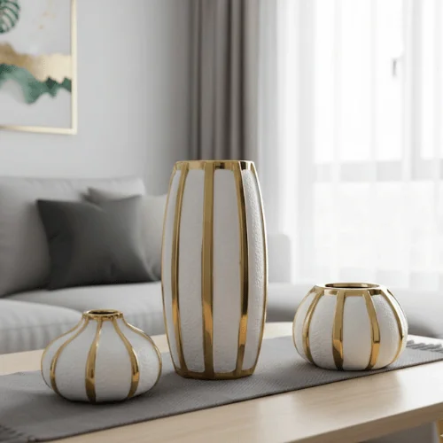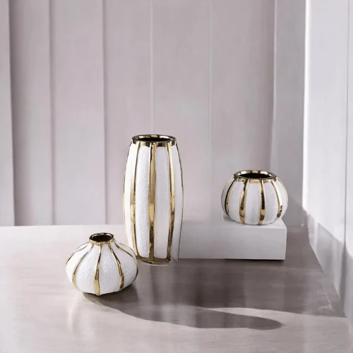 Elevate your interior styling with the refined elegance of the LUXORA Golden Crest Table Vase Set. This curated 3-piece ceramic collection blends sculptural form with luxurious detailing, finished in a soft white glaze highlighted by graceful gold line accents for a sophisticated, modern look.