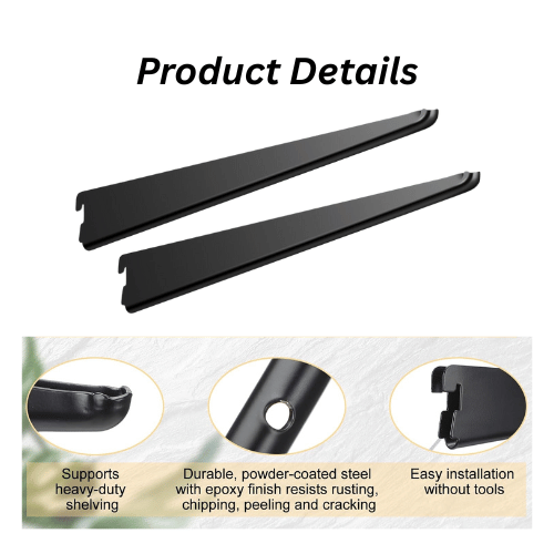 The black powder-coated finish not only gives a refined, contemporary look but also offers superior resistance to corrosion, scratches, and wear, ensuring long-lasting performance even in demanding environments. Easy to install and adjust, this bracket allows flexible shelf positioning to meet changing display needs.