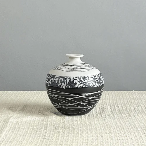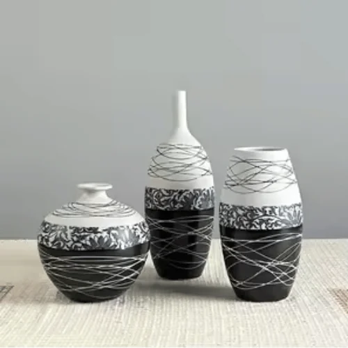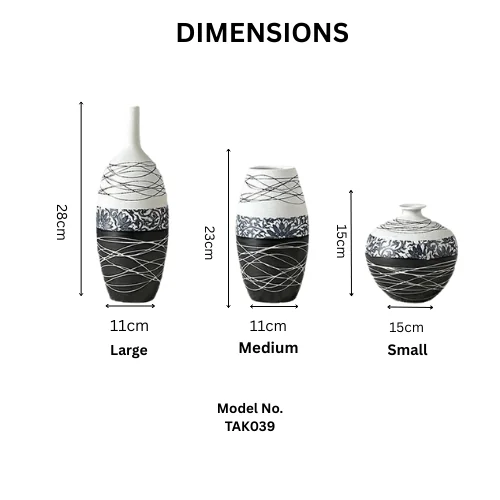 Add modern artistry to your home with the Monochrome Essence Table Vase Set. This 3-piece ceramic collection combines bold graphic minimalism with classic Oriental-inspired elegance. Each vase is designed with a distinct silhouette—globular, bottle-necked, and tapered ovoid—creating a dynamic visual trio perfect for tables, shelves, and console displays.