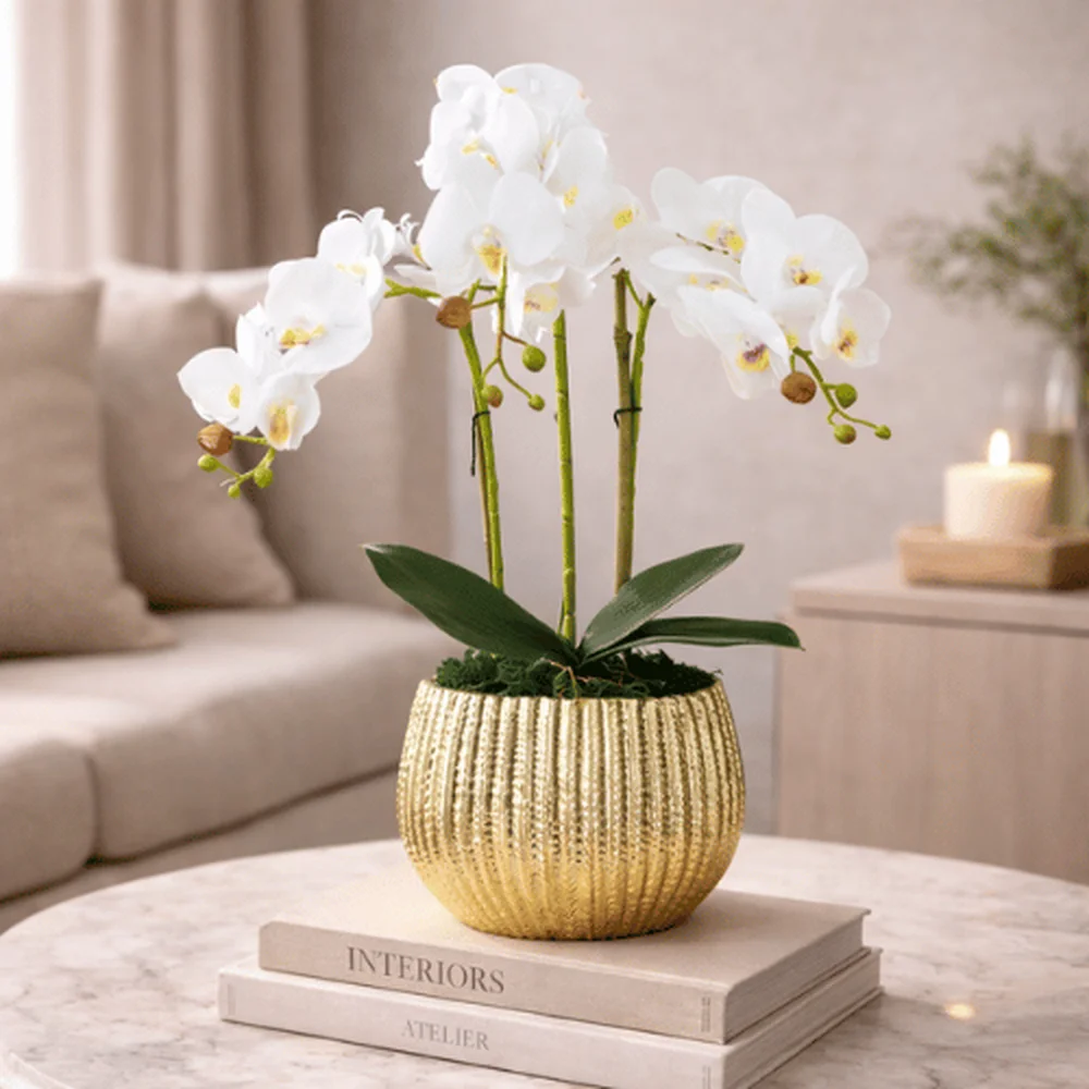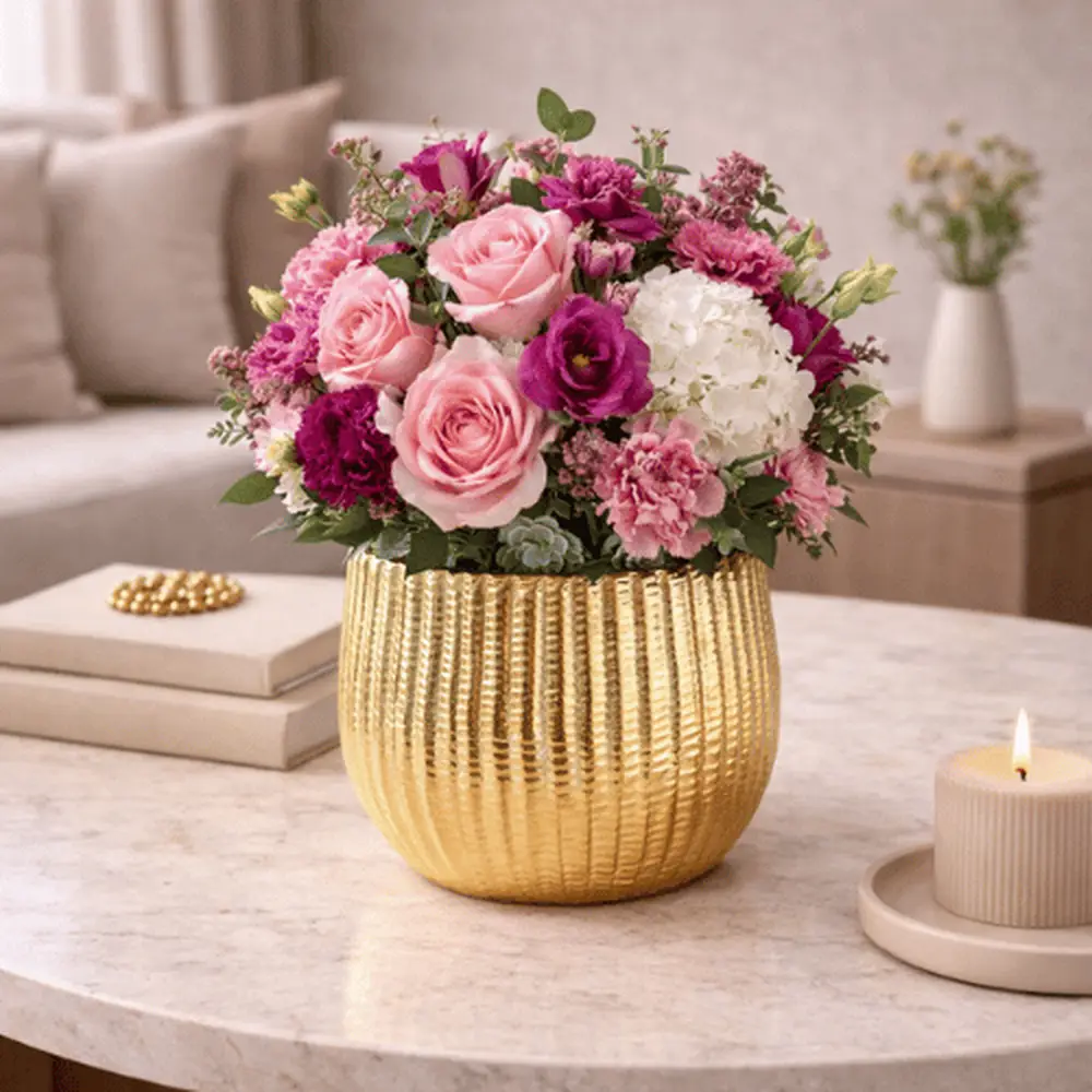 Crafted from high-quality ceramic, it features a vertically ribbed textured surface that adds depth, dimension, and visual interest. The glossy gold finish beautifully reflects light, creating a warm, elegant glow that enhances floral arrangements, orchids, succulents, or standalone decorative styling.