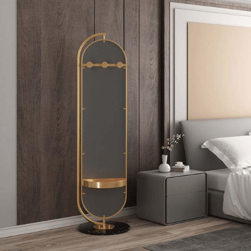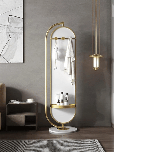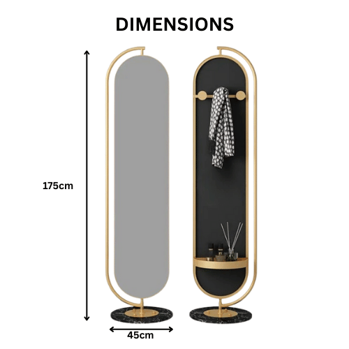The Solid Rotatable Standing Mirror with Storage MIR17 is a sleek and multifunctional home essential designed for both practicality and modern style. Featuring an ultra-narrow gold frame enhanced with gold nanoparticles and a luxurious black marble base, this mirror adds instant elegance to any space. Its full-length 45 × 175 cm design provides a complete head-to-toe reflection, making it perfect for dressing rooms, bedrooms, hallways, or living areas.