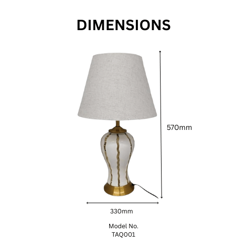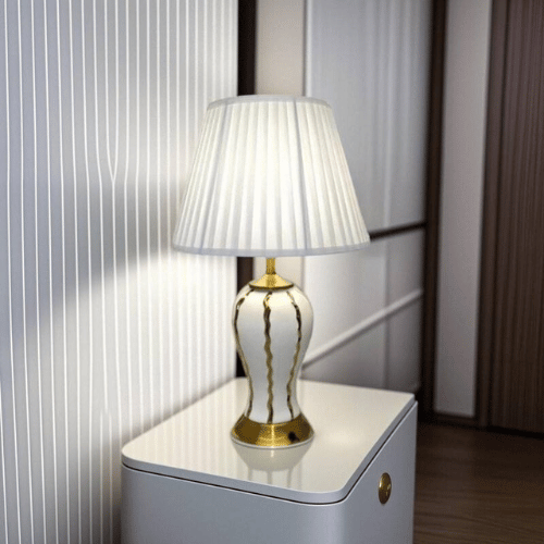 The lamp features a premium ceramic body finished in elegant white, highlighted by vertical golden ribbed metallic accents that add depth, texture, and a sense of modern luxury. Complementing the design is a gold-finished metal base and neck, providing stability while reinforcing its refined aesthetic. Modern Royal Golden Ribbed Ceramic Table Lamp The look is completed with a classic tapered fabric lampshade in soft white or linen tones, which gently diffuses light for a warm and welcoming glow.