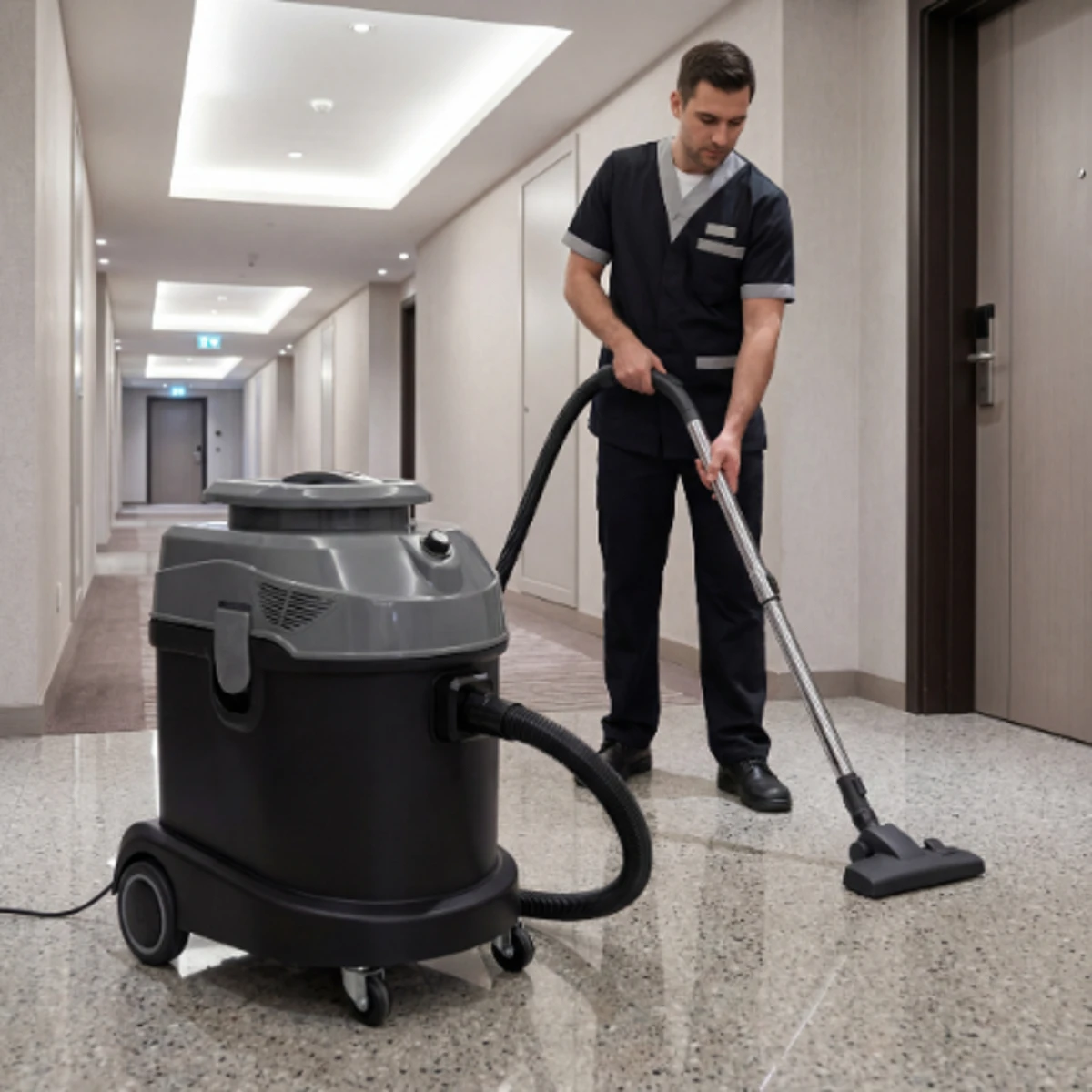 This 45-liter silent dry vaccum cleaner is designed for efficient and low-noise cleaning in commercial and professional environments. With a powerful motor and large capacity tank, it effectively removes dust, dirt, and fine particles while maintaining quiet operation, making it ideal for hotels, offices, hospitals, and other noise-sensitive areas.