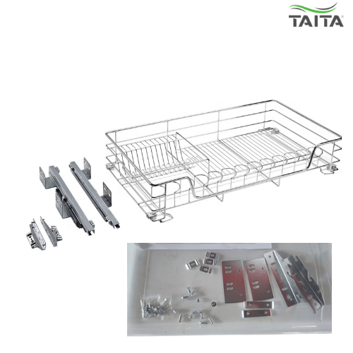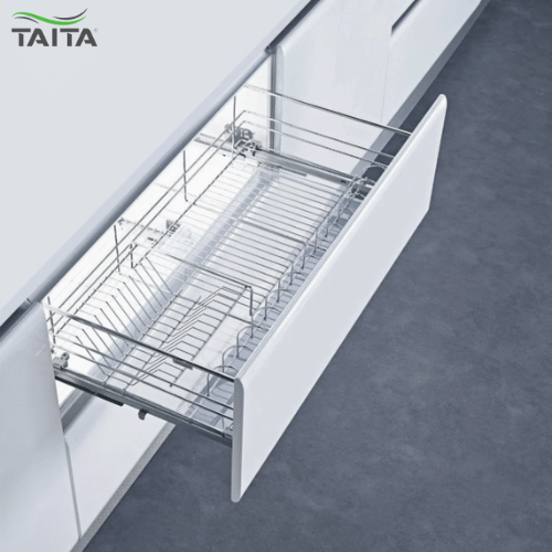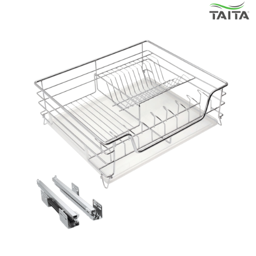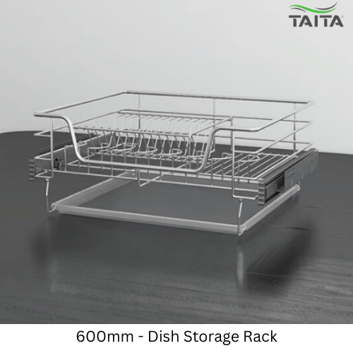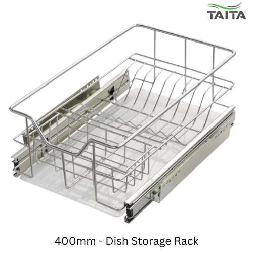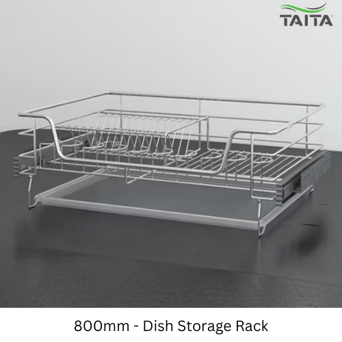 Crafted from high-quality stainless steel, the rack is rust-resistant, heavy-duty, and built to support long-term use. Its smooth, silent buffer damping rails ensure an easy gliding motion, allowing you to pull the rack out fully without noise or strain. TAITA High Quality Stainless Steel Dish Storage Rack The elevated wire frame structure keeps your dishes securely in place, while the included drip tray collects excess water—preventing moisture buildup and keeping your cabinet interior dry and hygienic.