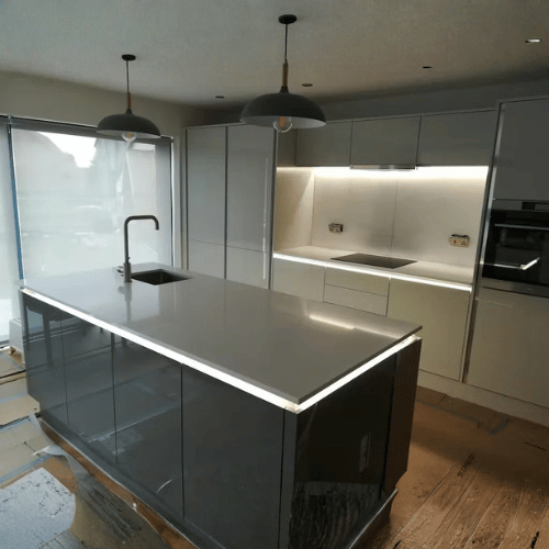 Designed to sit neatly just below the lip of worktops, this profile is ideal for handleless cabinets, drawers, wardrobes, and dressers, illuminating channels evenly while protecting the flexible LED strip from daily hand contact. The included white K-shaped diffuser ensures a smooth, uniform spread of light with no visible LED dots, delivering a clean and professional appearance.