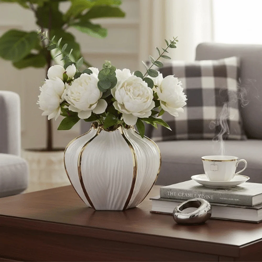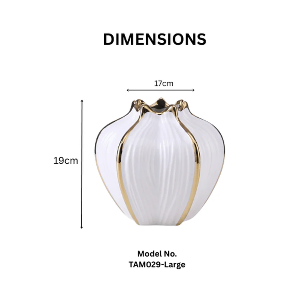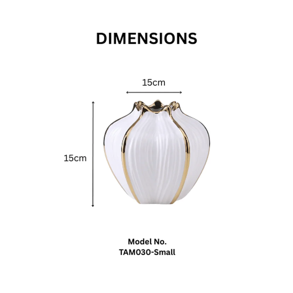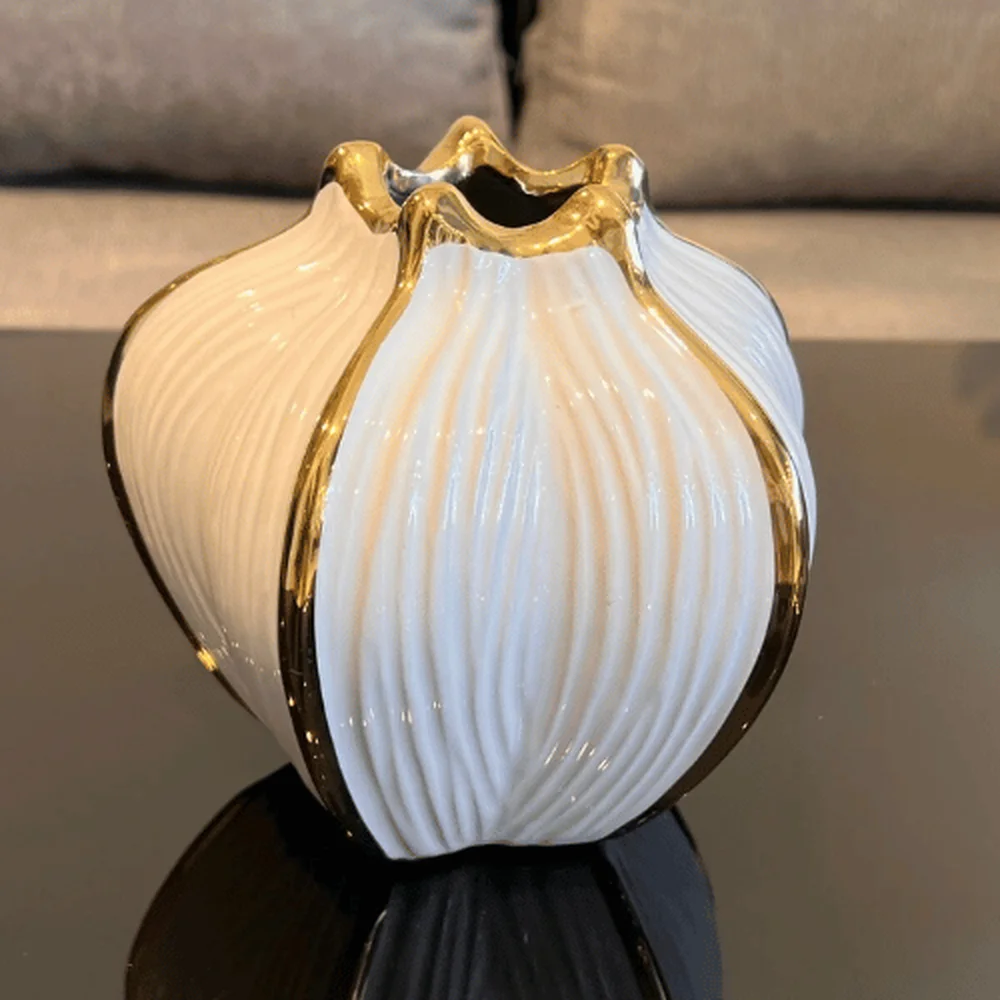 Graceful and eye-catching, the White Crown Ceramic Vase is designed to elevate modern interiors with its sculptural pumpkin-petal silhouette and refined gold rim detailing. The soft white ceramic body paired with elegant metallic accents creates a perfect balance between minimalism and luxury.