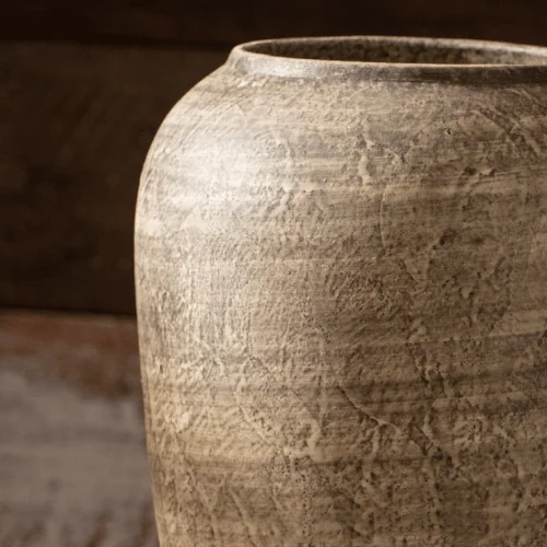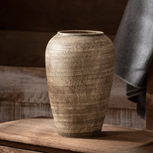 The sand-colored finish features subtle variations in shading, lending a distressed, natural, and earthy look reminiscent of aged pottery. Its rustic texture enhances the tactile and visual appeal, making each piece feel handcrafted and unique.